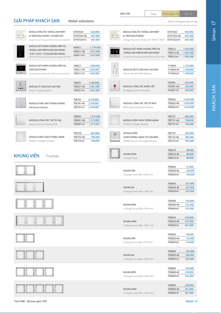 Bảng giá Catalogue công tắc ổ cắm Simon Series I7 mới nhất