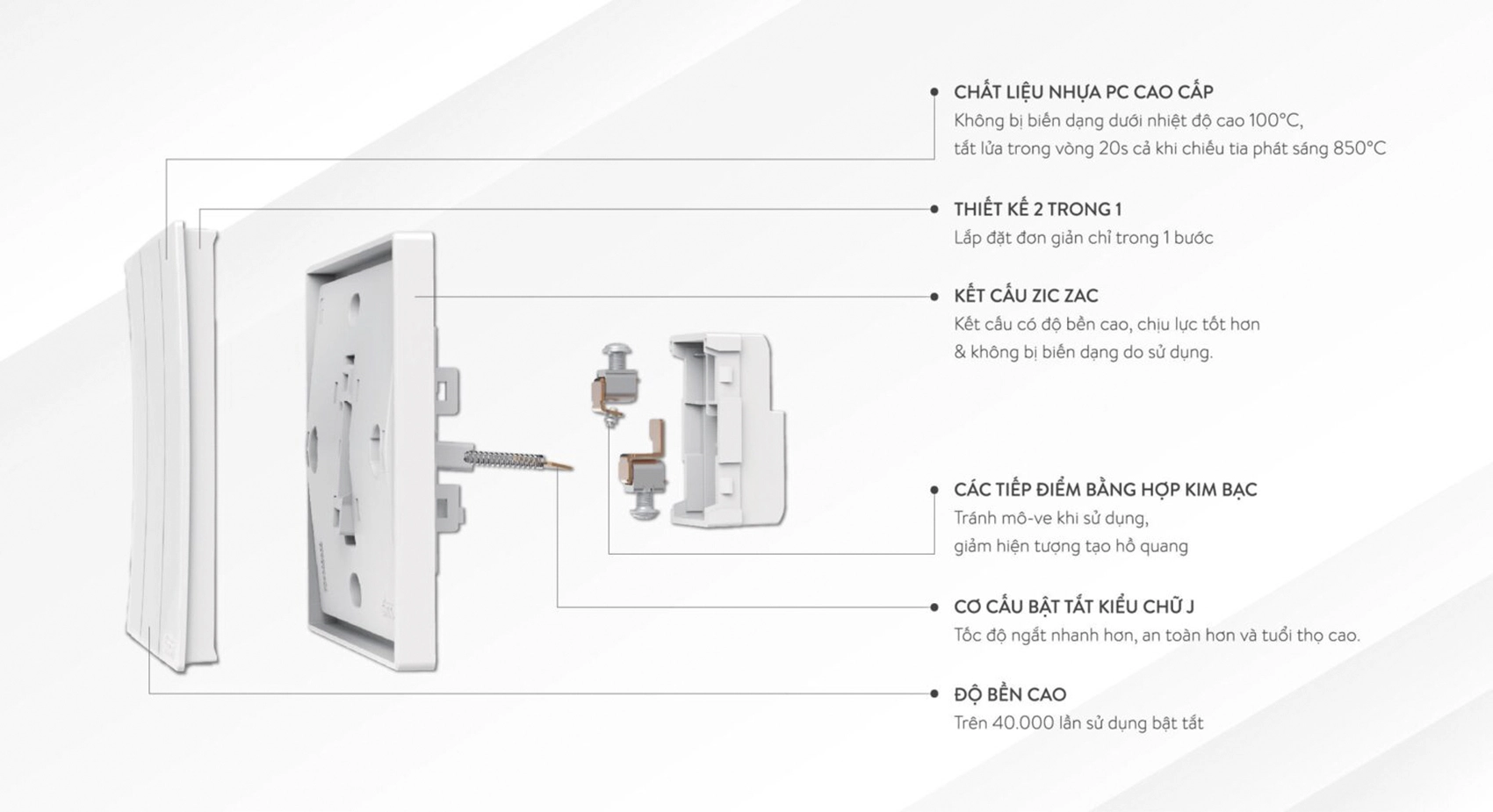 Chất liệu cao cấp: Sử dụng nhựa ABS chất lượng cao, đảm bảo độ bền, khả năng chịu lực tốt và chống cháy hiệu quả.
