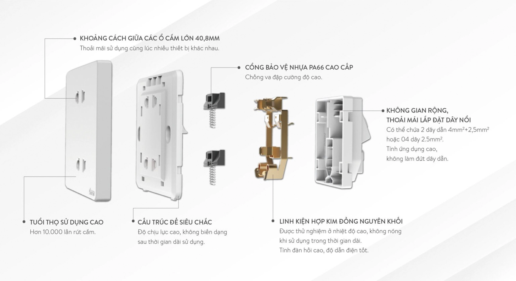 An toàn tuyệt đối: Hệ thống tiếp điểm chống quá tải và ngăn chặn nguy cơ chập điện, bảo vệ thiết bị và người dùng.