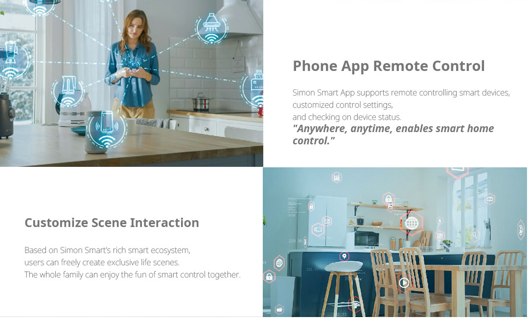 Tương thích với hệ thống nhà thông minh: Công tắc ổ cắm Simon M7 Smart hoàn toàn tương thích với các hệ thống nhà thông minh như Google Home, Amazon Alexa, giúp bạn điều khiển thiết bị bằng giọng nói một cách dễ dàng và nhanh chóng.