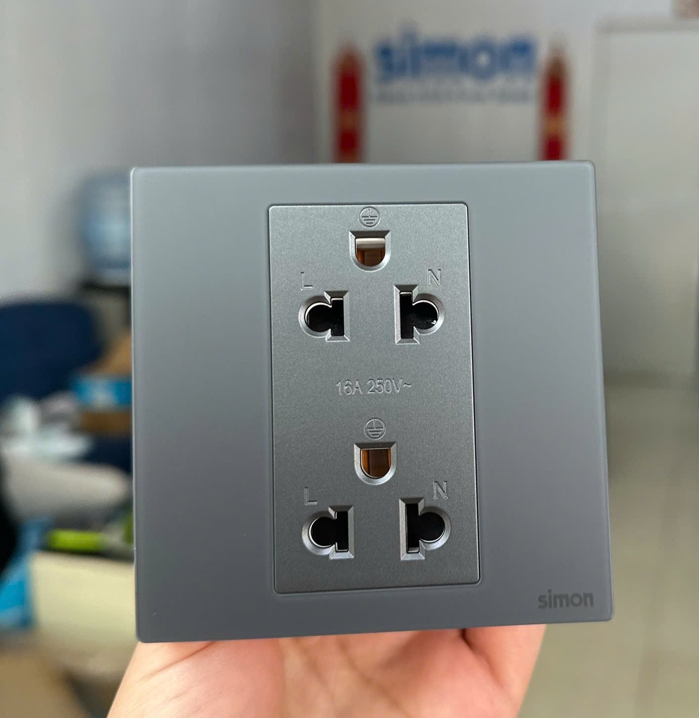 Bộ ổ cắm đôi 3 chấu Âu Mỹ màu xám mặt kính Simon M7 661287G-4D lắp đế vuông