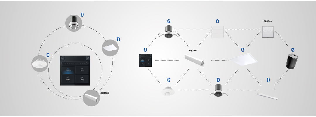 có thể được sử dụng để dễ dàng điều khiển hệ thống chiếu sáng trong không gian văn phòng, với sự hỗ trợ của bảng điều khiển Office Pad, cảm biến 2 trong 1, đèn thông minh BLE, động cơ rèm thông minh, v.v.